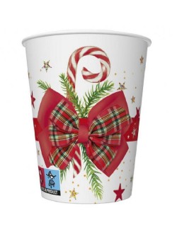 Set 8 pahare cu Fundita Craciun, 250 ml, din carton, de unica folosinta, potrivite pentru petrecerile de Craciun.