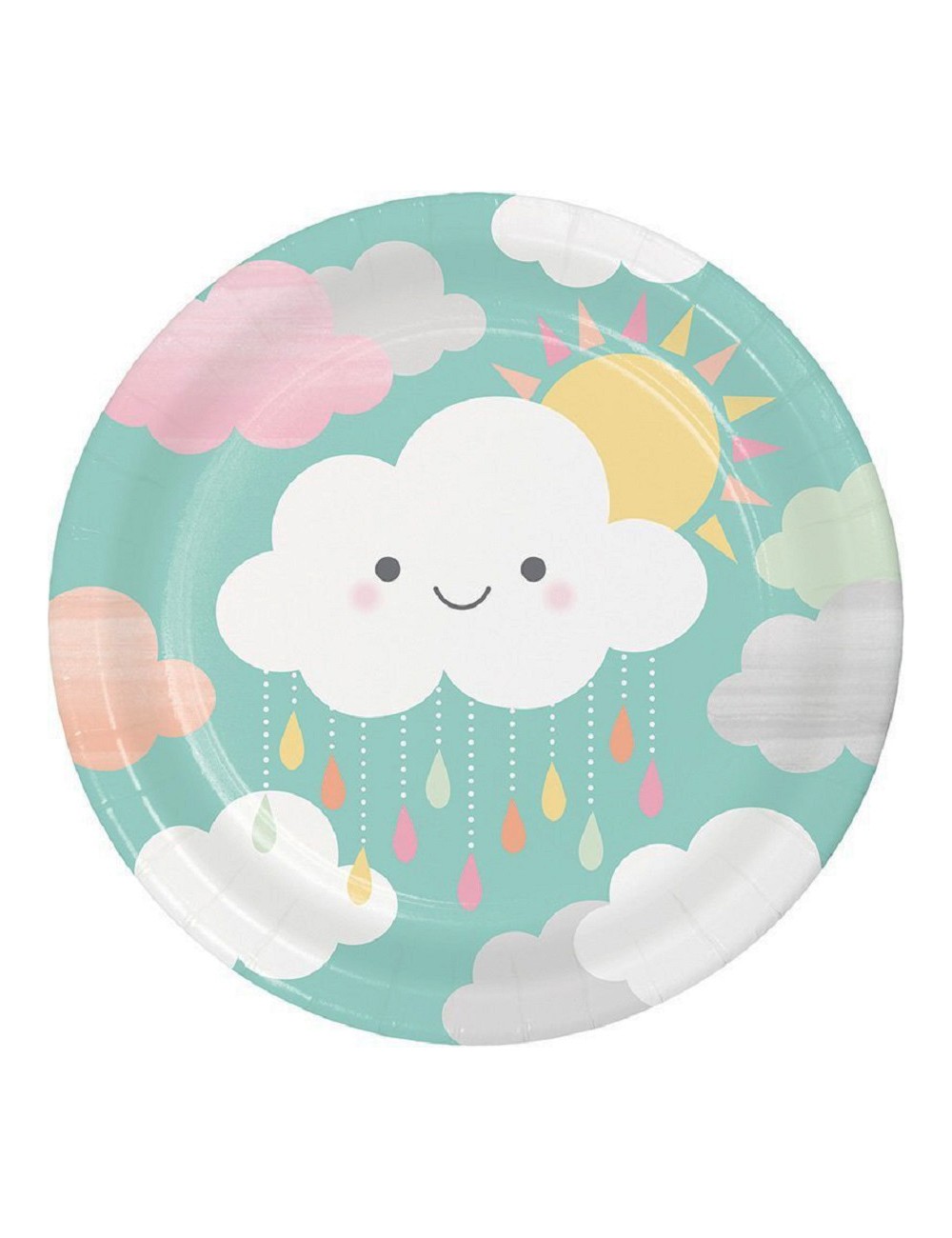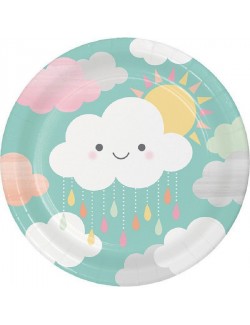 Set 8 farfurii Norisori, Sunshine clouds, diametru 23 cm, de unica folosinta, fabricate din carton, fond verde-menta, imprimeu multicolor.