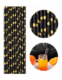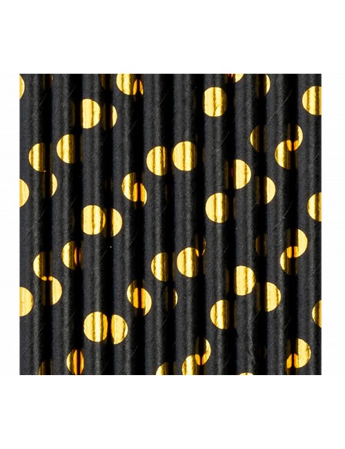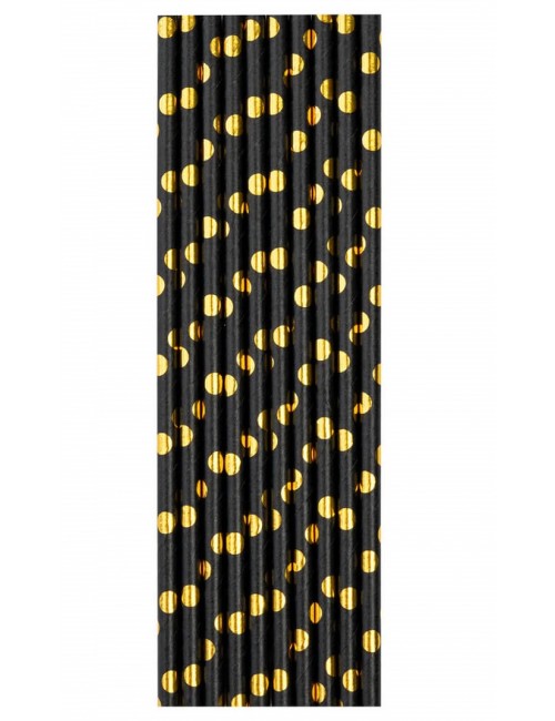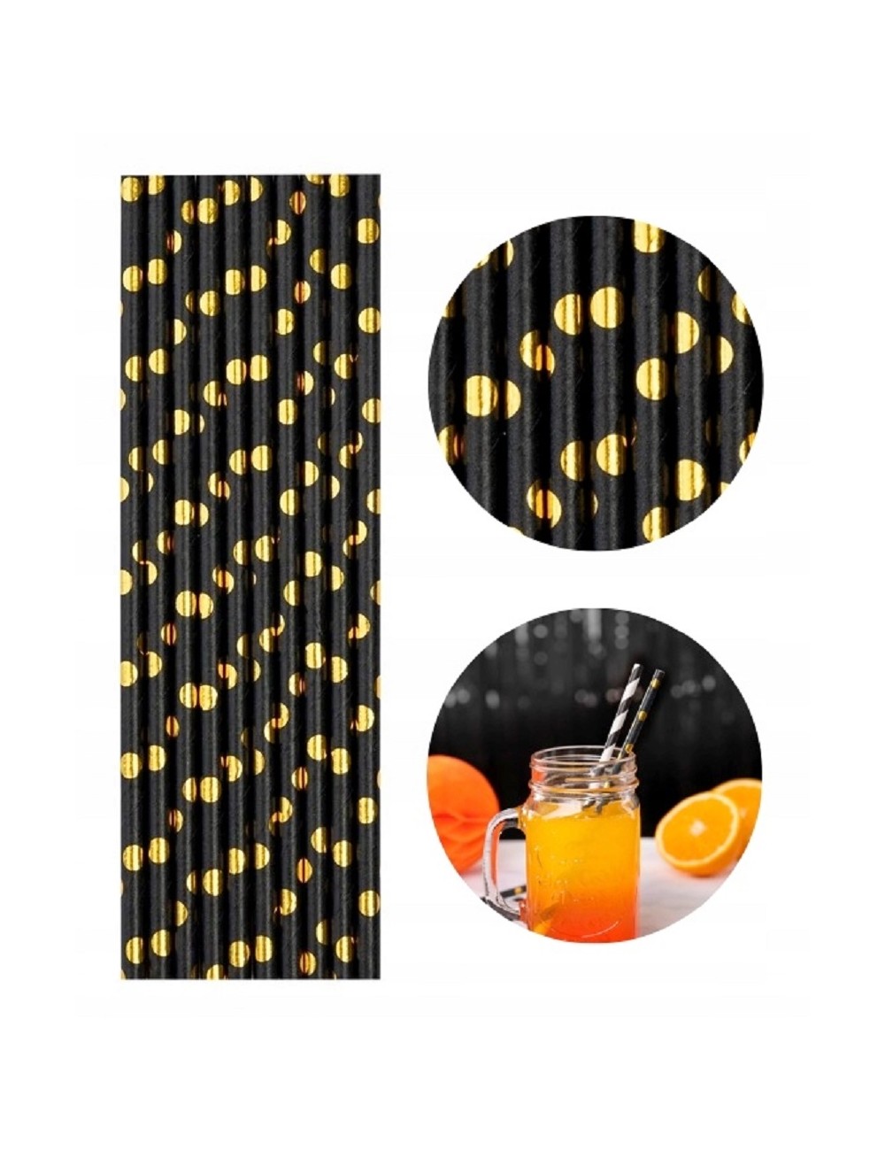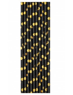 Set 10 paie de hartie, negre cu buline aurii, lungime 20 cm, potrivite pentru bauturi cu temperaturi mai mici de 40 C.