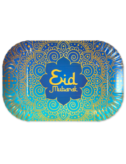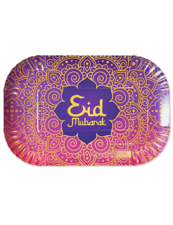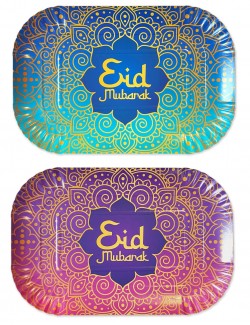 Set 2 Platouri pentru mancare Eid Mubarak - Ramadan, dimensiuni 29 x 19 cm, culori asortate - mov si albastru cu detalii aurii, din carton, adaugă o notă de eleganță și culoare oricărei mese.