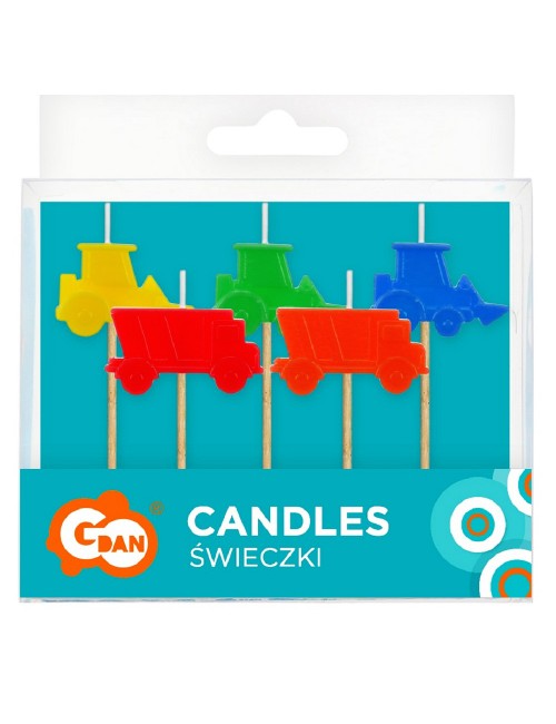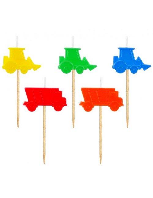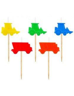 Set 5 lumanari tort, Utilaje multicolore, din parafina, fixate pe suport din lemn, inaltime totala aprox. 6,5 cm.