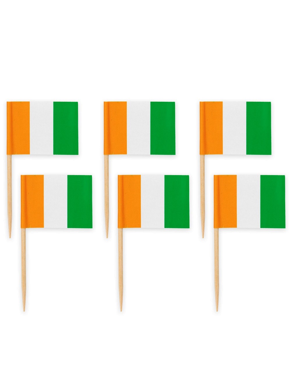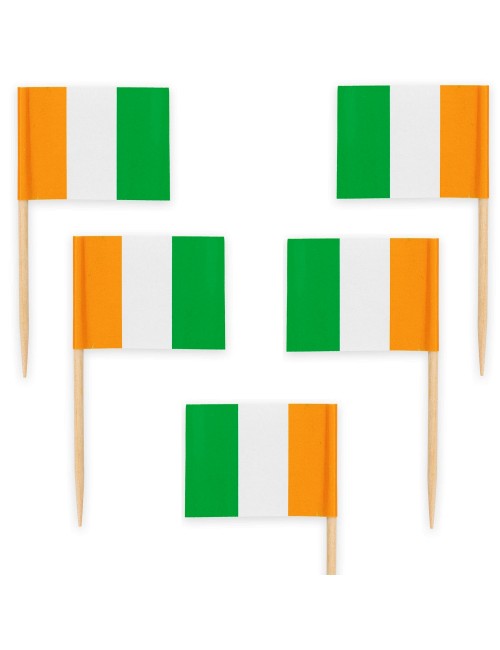 Set 50 Scobitori decorative, Steag Irlanda, inaltime aprox. 6,5 cm, latime 3,5 cm, suport din lemn si steag din hartie imprimata.