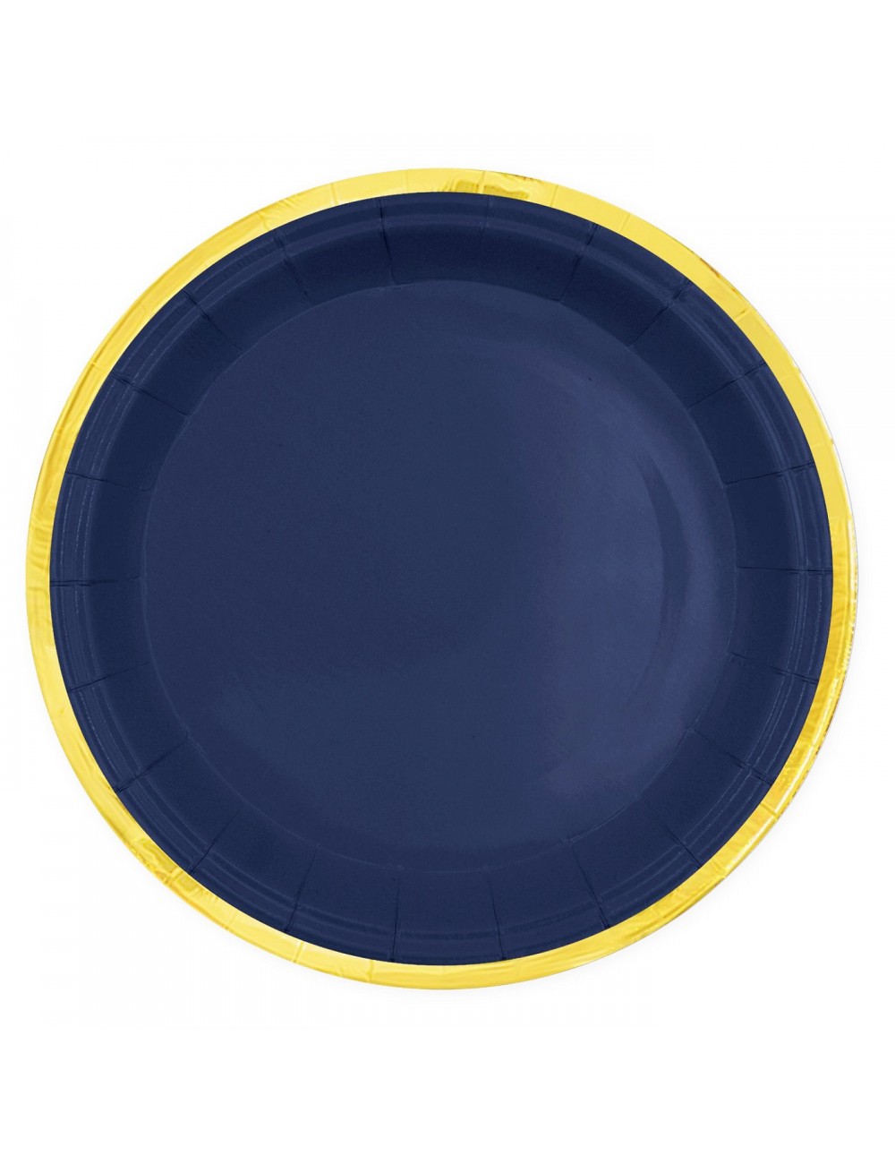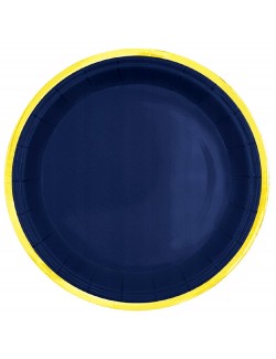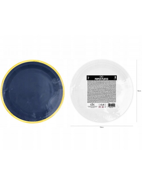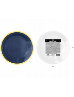 Set 6 farfurii albastru-inchis, cu garnitura aurie, diametru 18 cm, de unica folosinta, fabricate din carton, nu contin plastic.