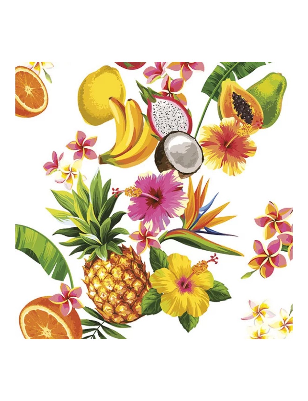 Set 20 servetele Mix Tropical Fruits, dimensiuni 33 x 33 cm (extins), din 3 straturi de hartie, fond alb, imprimeu multicolor.