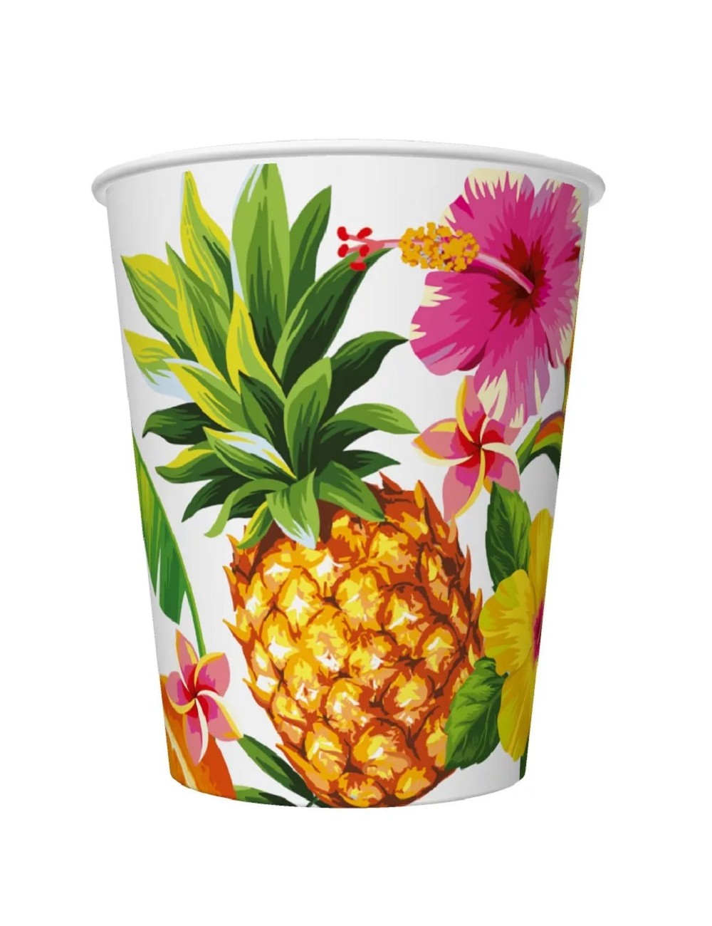 Set 8 pahare Mix Tropical Fruits, 250 ml, inaltime 9 cm, de unica folosinta, din carton, imprimeu multicolor cu fructe si flori tropicale.