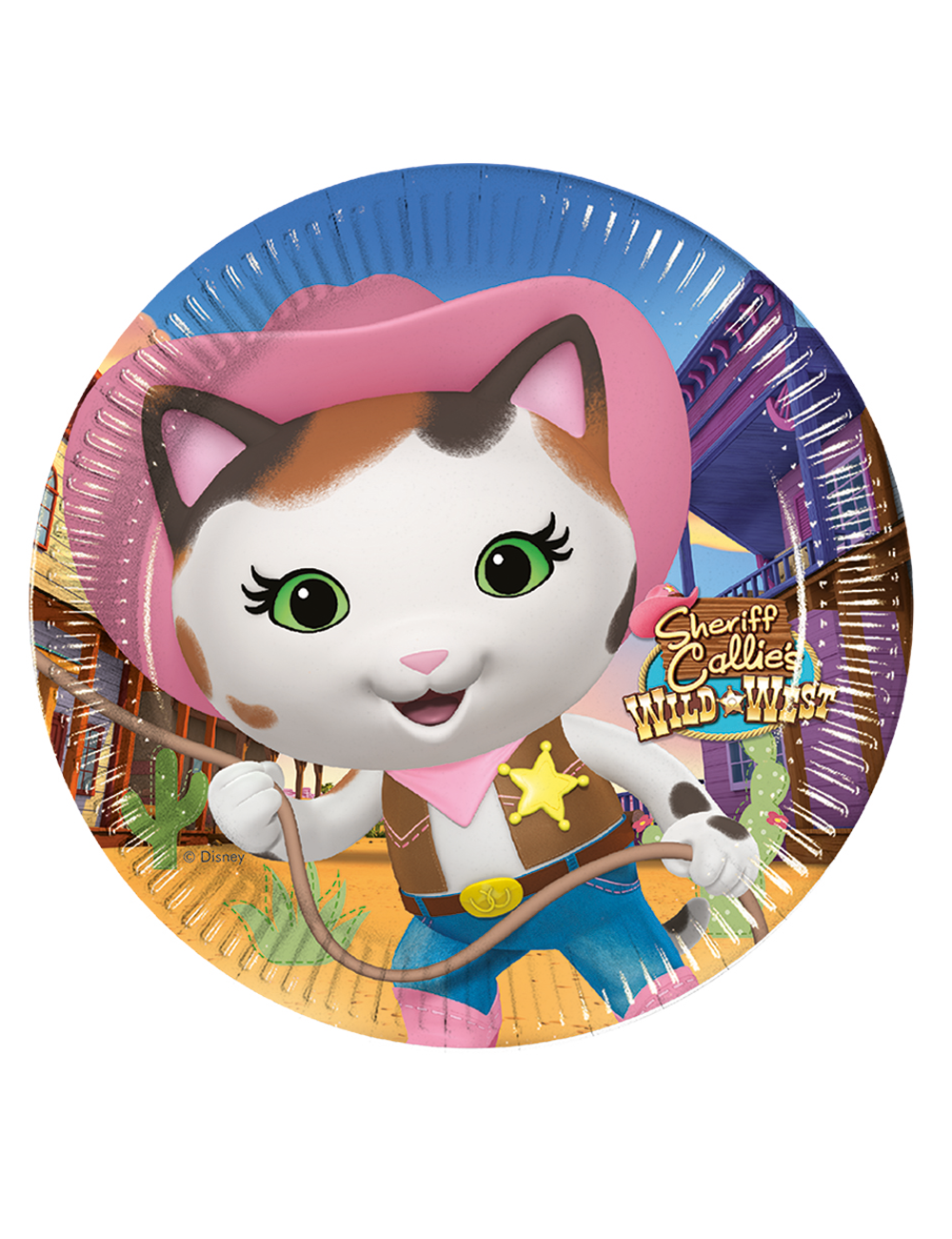 Set 8 farfurii Pisicuta Calie, neinfricat Serif al Vestului salbatic, diametru 20 cm, de unica folosinta, imprimeu multicolor, din carton.