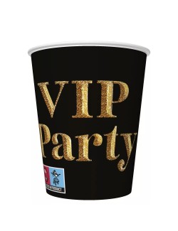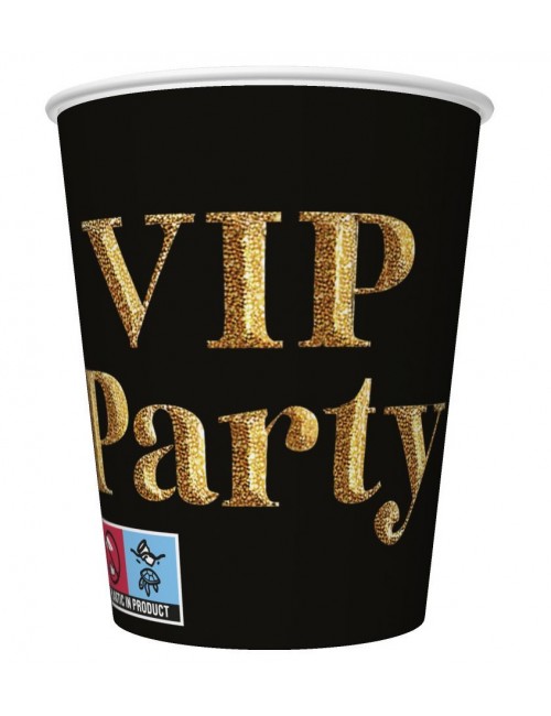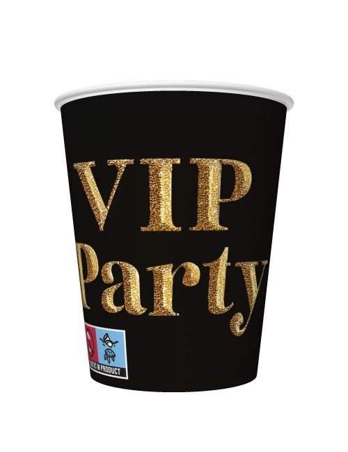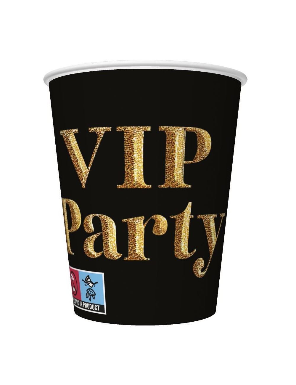 Set 8 pahare Party gold VIP, capacitate 250 ml, inaltime 9,5 cm, din carton, de unica folosinta, culori negru-auriu, perfecte pentru petreceri elegante.
