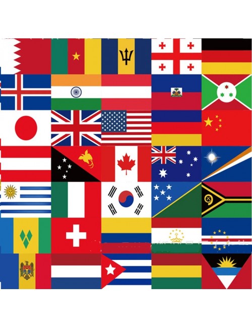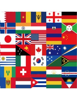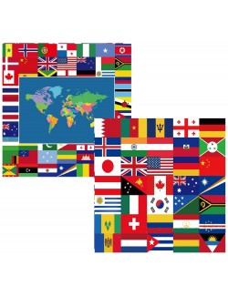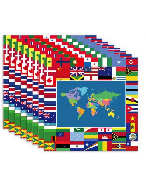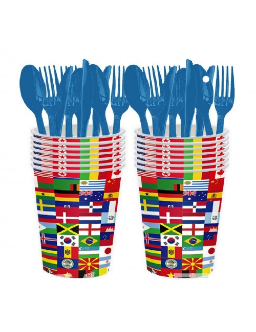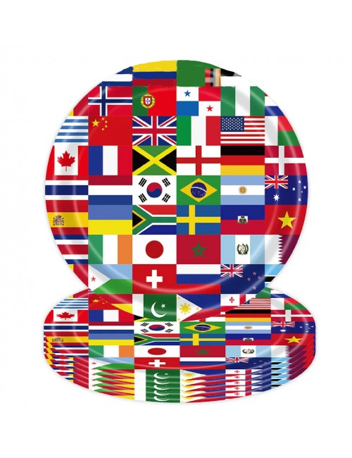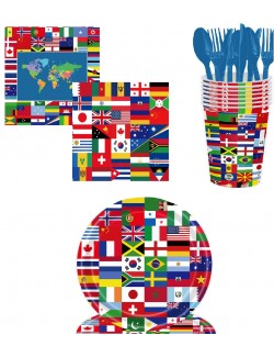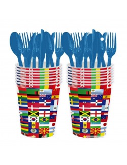 Set petrecere Steaguri internationale, pentru 8 persoane, contine 8 servetele cu 2 fete, din hartie 33 x 33 cm (extins), 8 pahare din carton de 250 ml si 8 farfurii de 18 cm, din carton, de unica folosinta.
