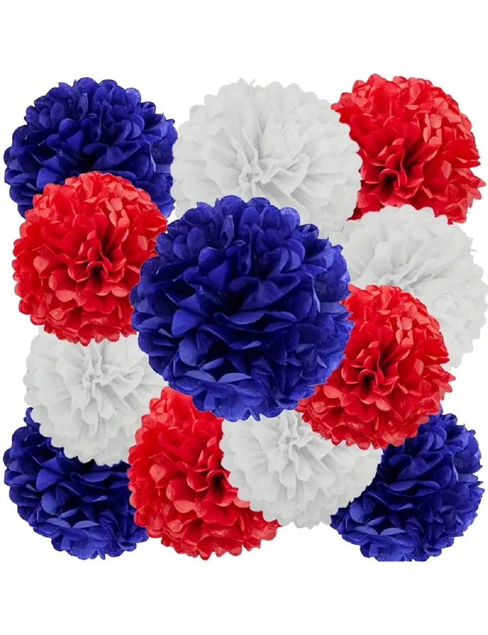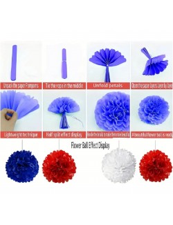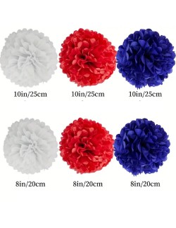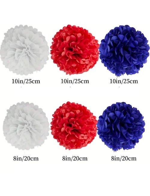 Set 6 Pompoane albastru-alb-rosu, din hartie colorata, cu diametre diferite: 20 cm (3 buc) si 25 cm (3 buc).