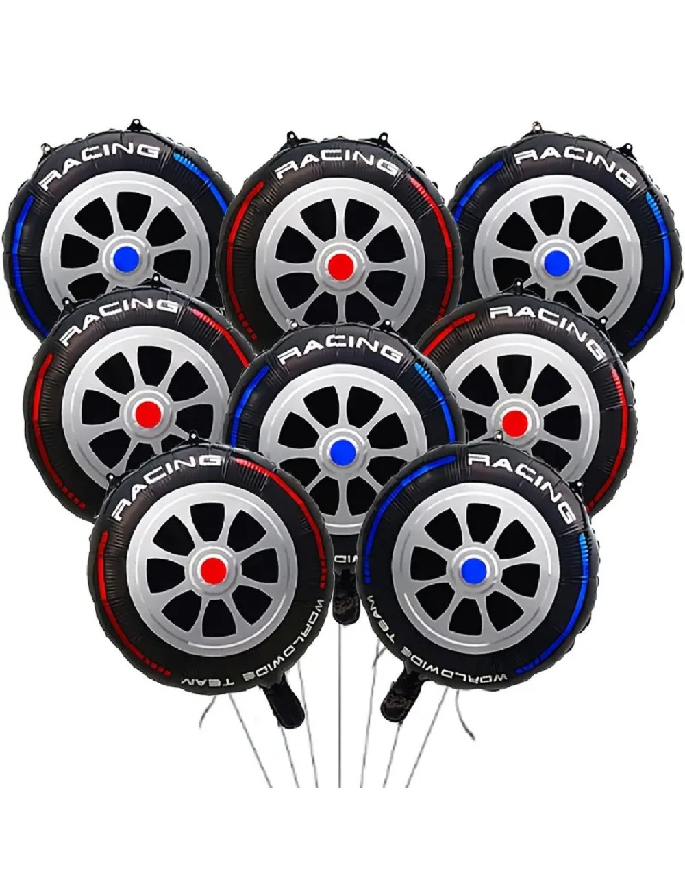 Balon folie Roata Masina curse, diametru 43 cm (dezumflat), culori negru-rosu-argintiu sau negru-albastru-argintiu, poate fi umplut cu aer (nu pluteste) sau heliu (pluteste).