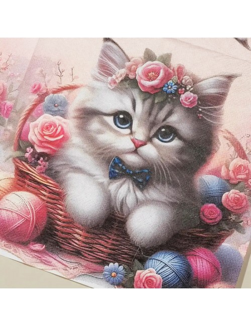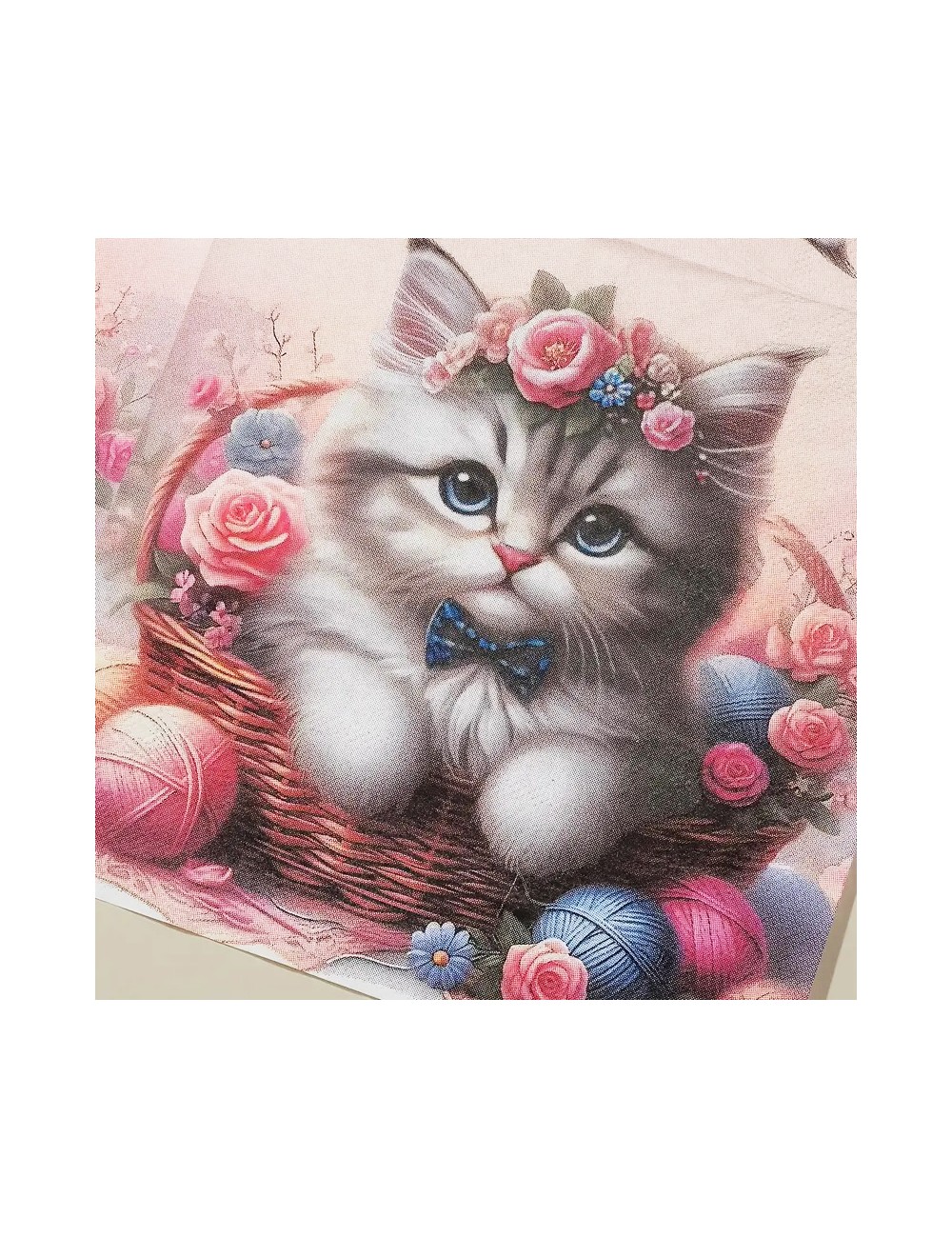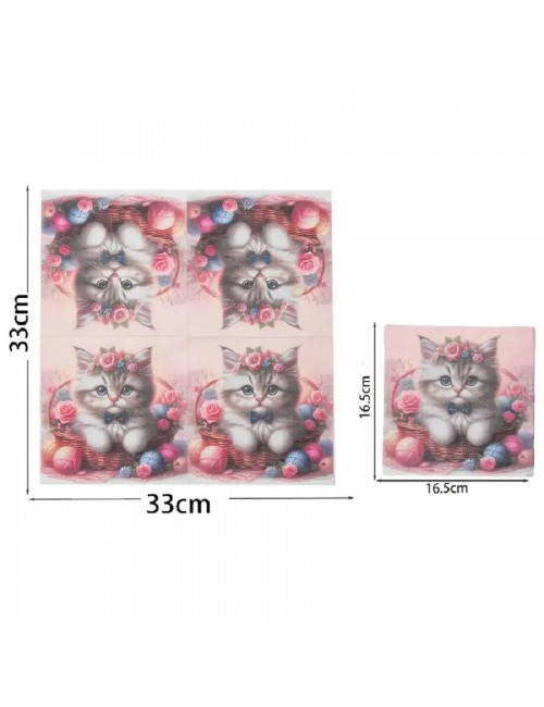 Set 10 servetele Pisicuta in cos, dimensiuni 33 x 33 cm (extins), din 2 straturi de hartie fina, culoare roz, imprimeu multicolor.