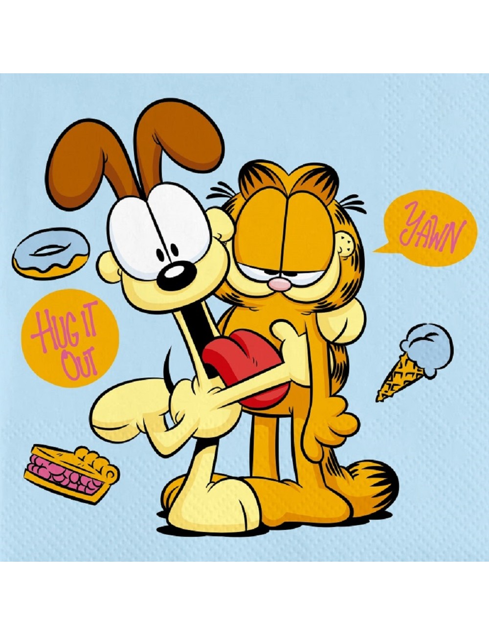 Set 20 servetele Garfield si Odie, dimensiuni 33 x 33 cm (extins), din 2 straturi de hartie, imprimeu identic fata-verso.