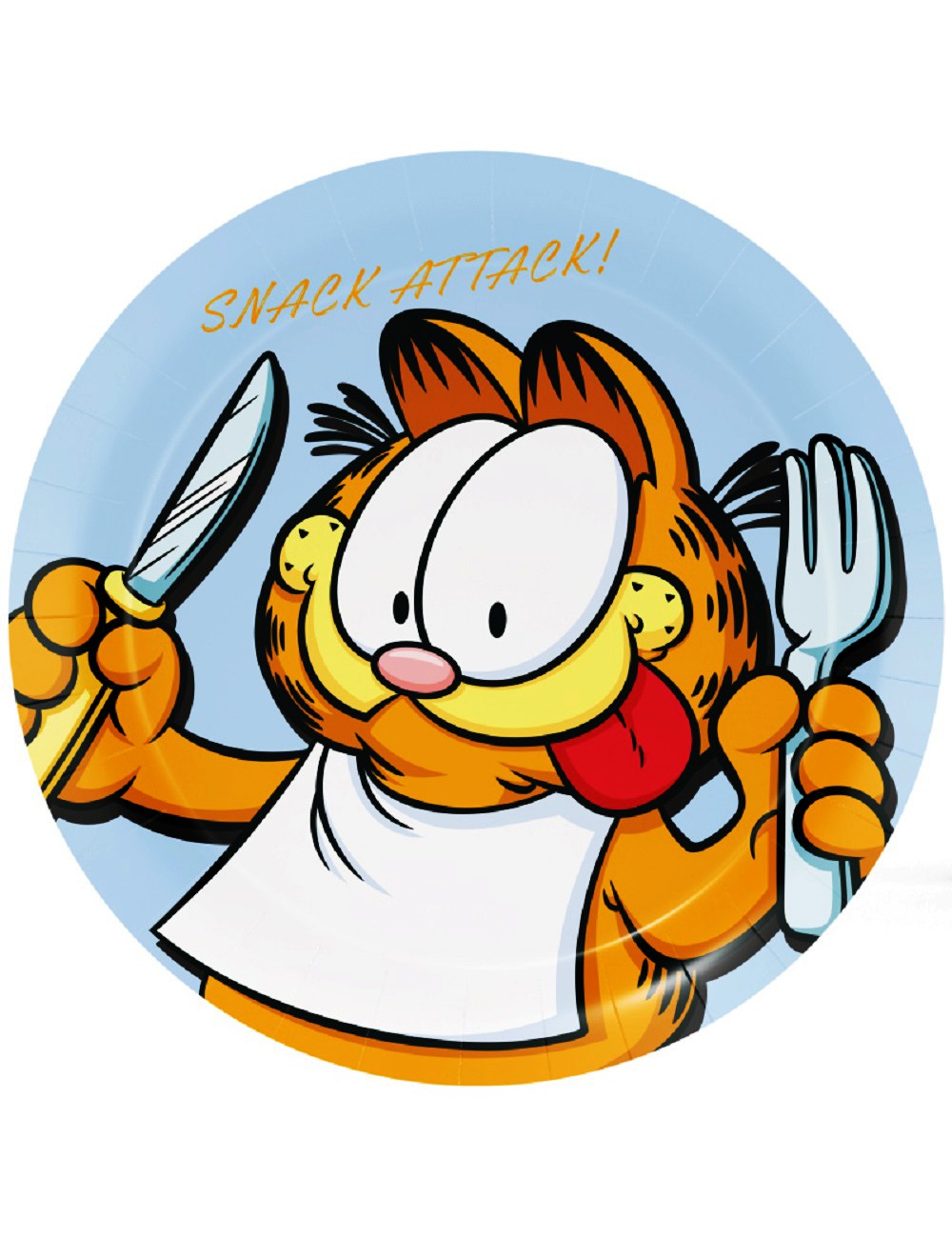 Set 8 farfurii petrecere, Garfield Snack attack!, diametru 23 cm, fabricate din carton, imprimeu amuzant cu lenesul si gurmandul motan.