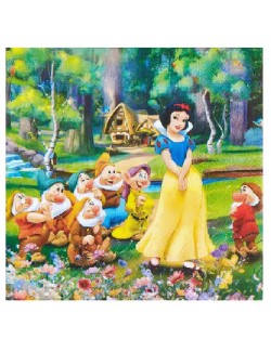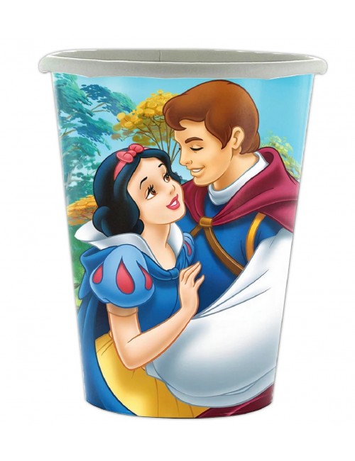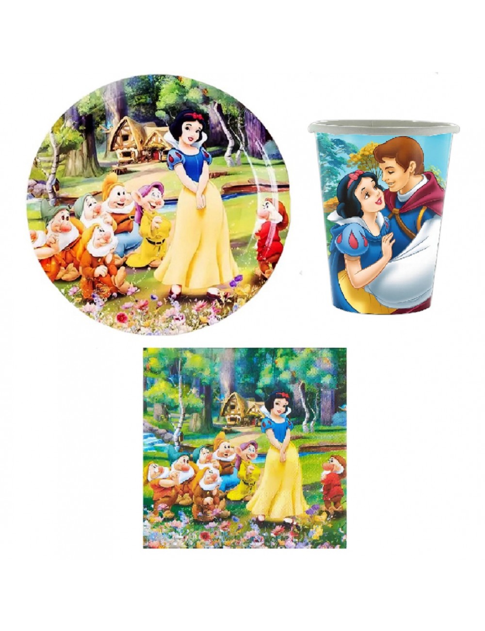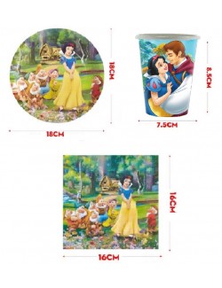 Set Alba ca Zapada si piticii, contine: 10 farfurii de 18 cm, 10 pahare de 250 ml, de unica folosinta, din carton si 10 servetele din 2 straturi de hartie, de 32 x 32 cm (extins).