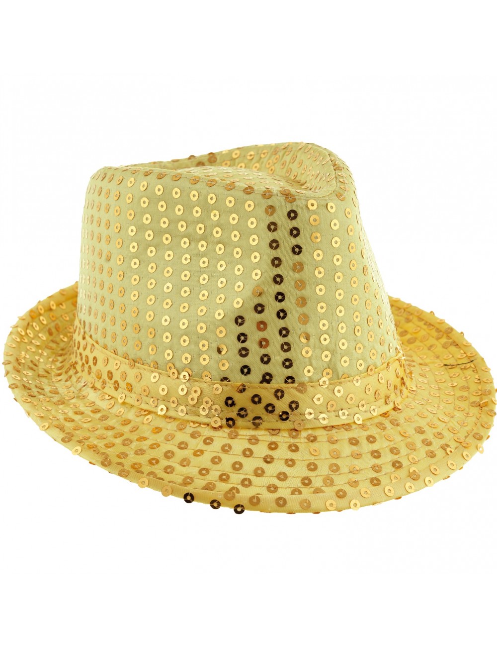 Palarie cu paiete aurii, pentru adulti, circumferinta aprox 58 cm, inaltime 12 cm, 95% poliester, 5% plastic.