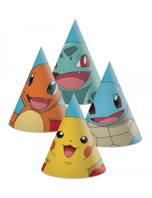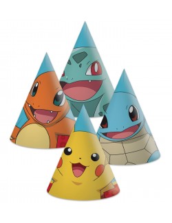 Set 6 Coifuri party Pokemon, din carton, prindere cu elastic, imprimate cu Pikachu, Bulbasaur, Squirtle si Charmander, dimensiuni 16 x 10 cm.