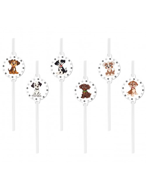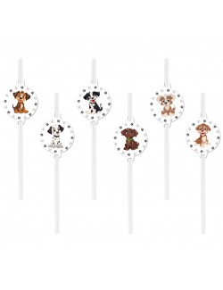 Set 6 paie cu Catei, pentru bauturi, din hartie alba, lungime 20 cm, nu sunt flexibile, au cate un medalion de 4 cm cu catei din diferite rase.