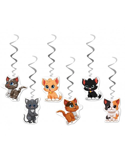 Set 6 decoratiuni suspendate, cu Pisici, contine 6 spirale din folie metalica de care sunt atasate decoratiuni din carton cu forma unor pisicute din rase diferite.