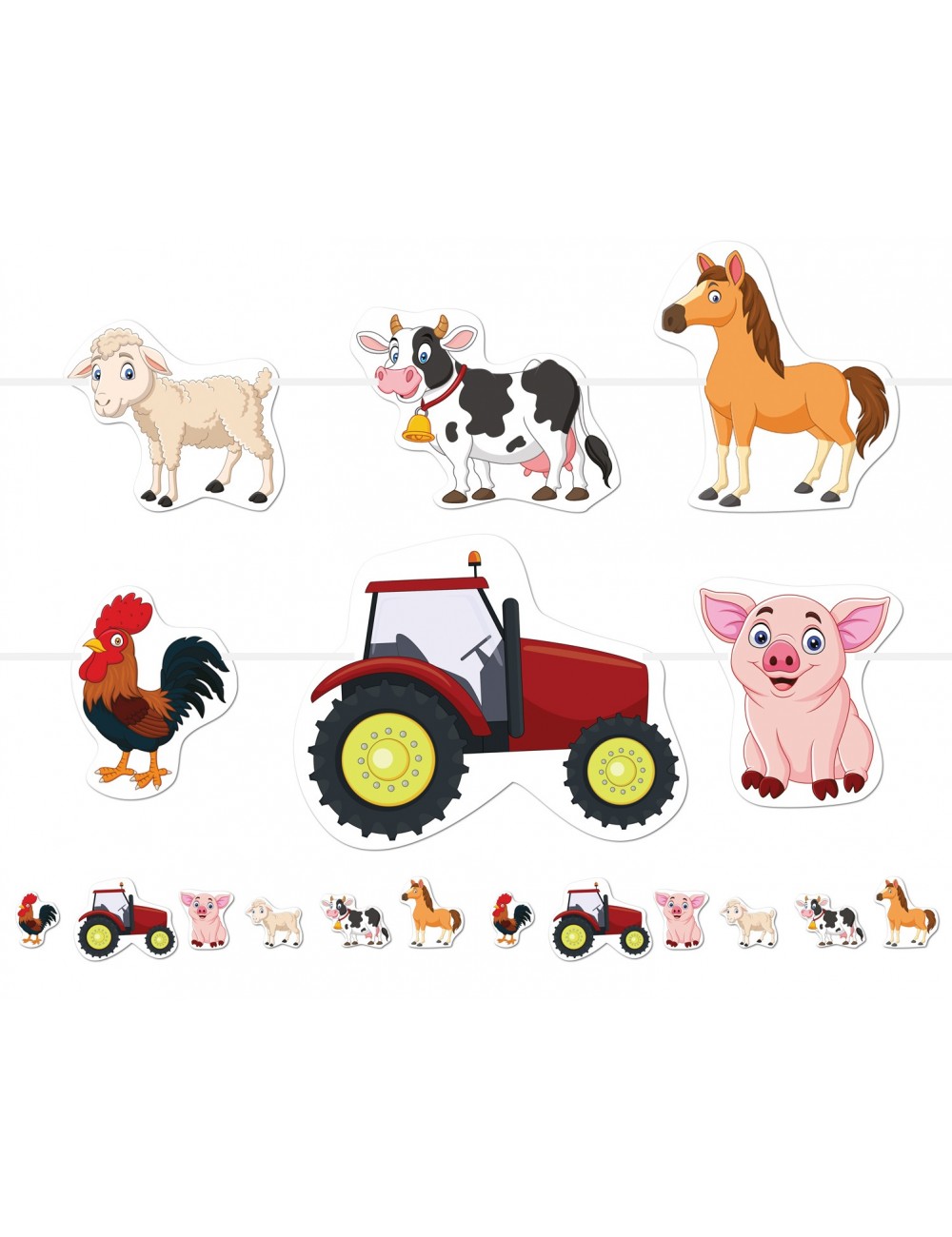 Ghirlanda cu Animale de la Ferma, lungime aprox. 500 cm, din hartie imprimata pe ambele fete, comtine 12 decoratiuni cu latime intre 8-17 cm.