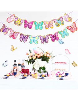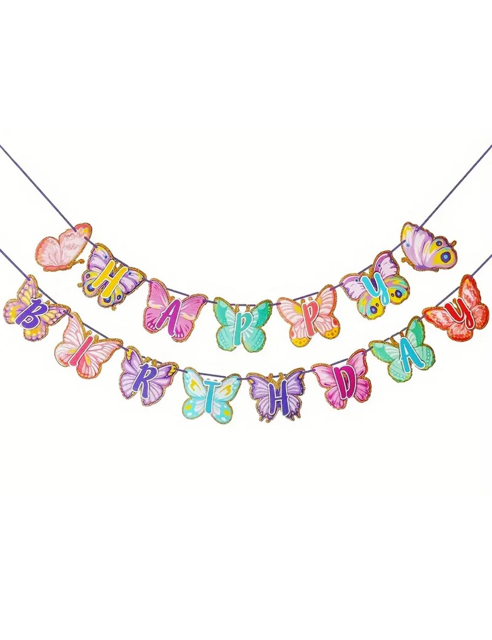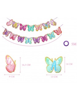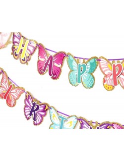 Ghirlanda Happy Birthday cu Fluturi din hartie colorata, chenar din sclipici auriu, lungime totala de aprox. 500 cm.
