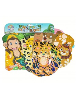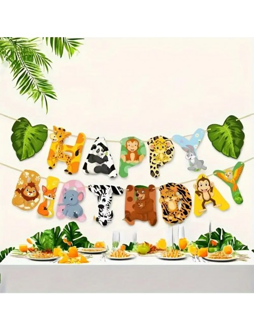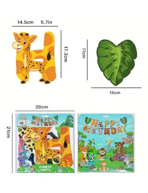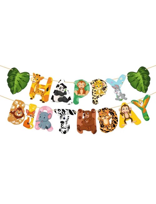 Ghirlanda Jungla Happy Birthday din hârtie iridescentă, lungime totala de aprox. 500 cm, contine animale: girafă, panda, maimuță, ghepard, iepure, leu, vulpe, elefant, zebră, urși, tigru, papagal.