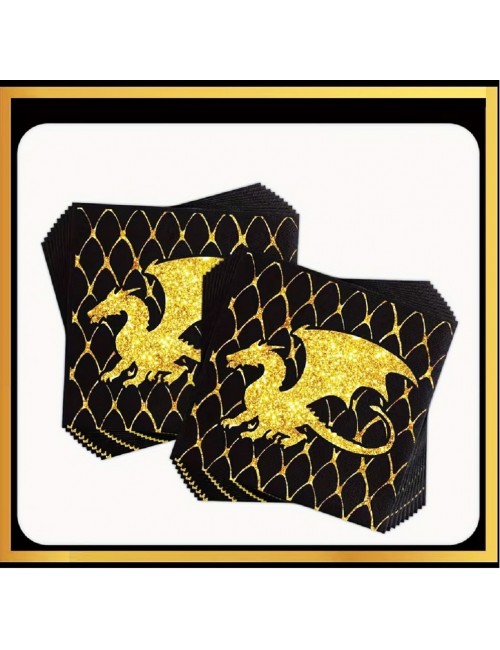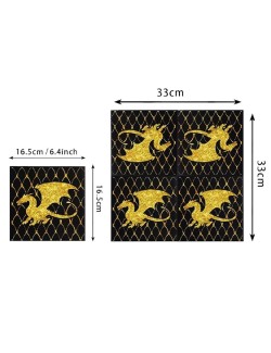 Set 11 servetele Dragon auriu, dimensiuni 33 x 33 cm (extins), din 2 straturi de hartie, fond negru, imprimeu auriu.