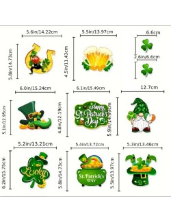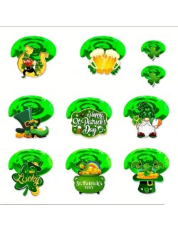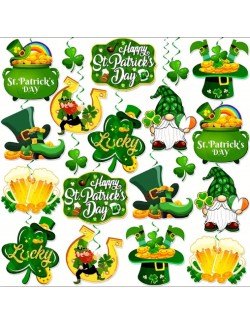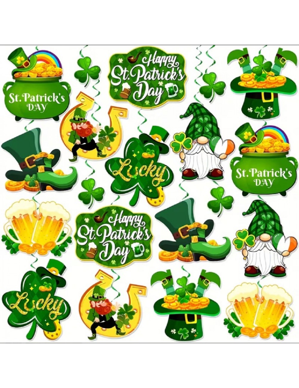 Set 10 decoratiuni suspendate St Patrick's Day, contine 10 spirale din folie metalizata si 10 medalioane din carton, cu modele si dimensiuni diferite.