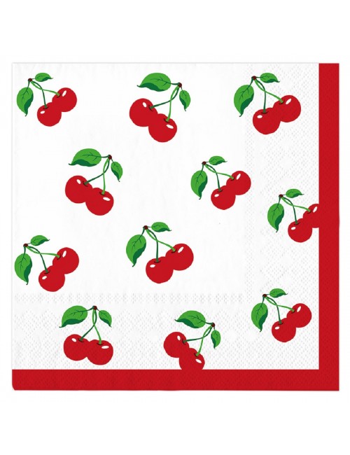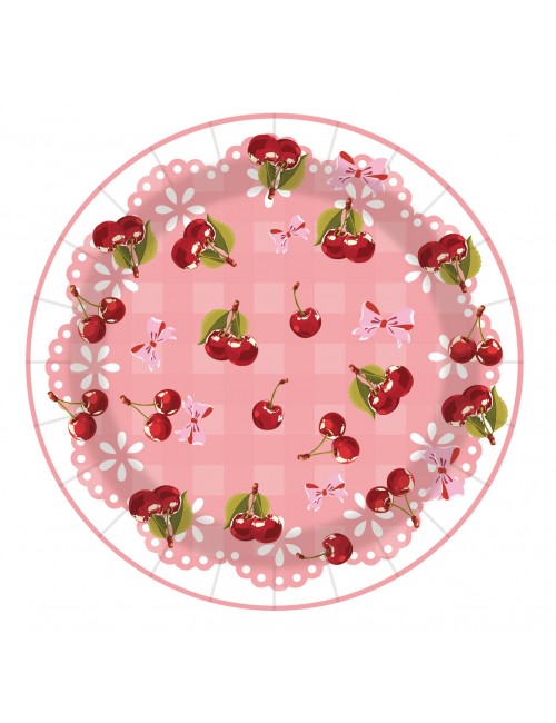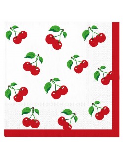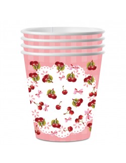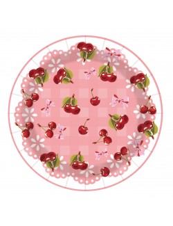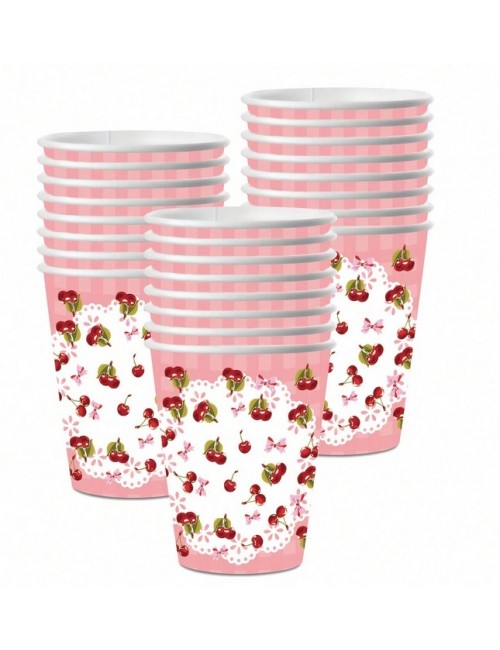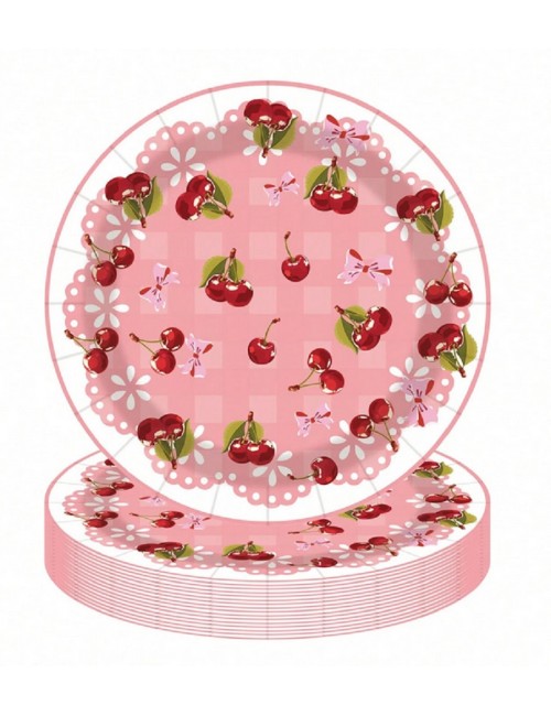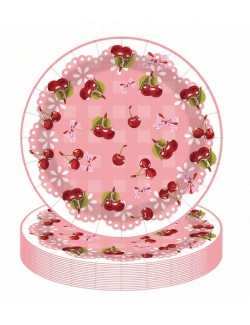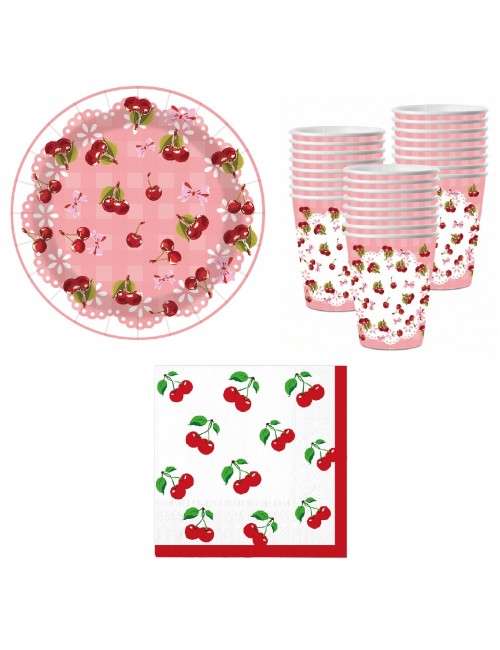Set Farfurii, servetele si pahare cu Cirese mici, pentru 10 persoane, contine produse de unica folosinta, din carton/ hartie: