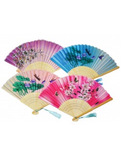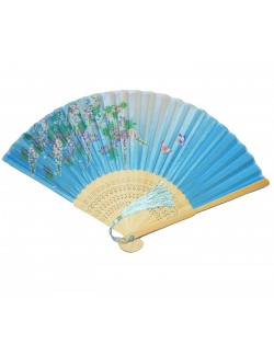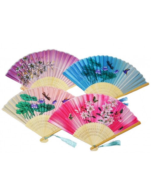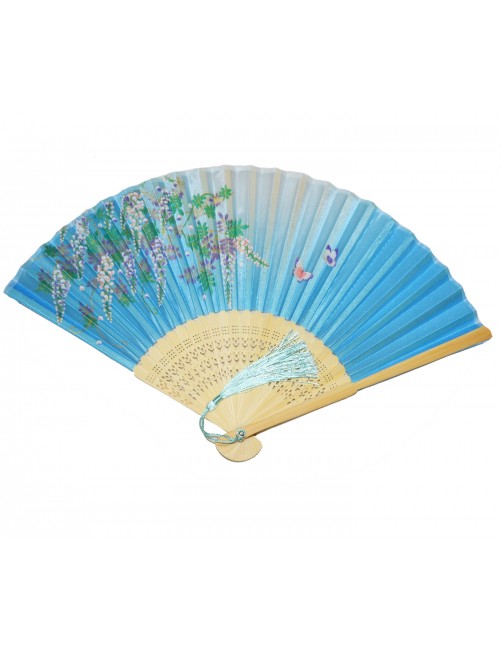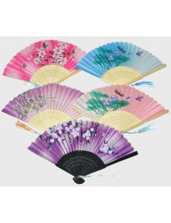 Evantai din bambus, cu imprimeuri de inspirație asiatică pe material sintetic și un ciucure (100% poliester), lungime 21 cm, latime aprox. 38 cm (desfășurat).