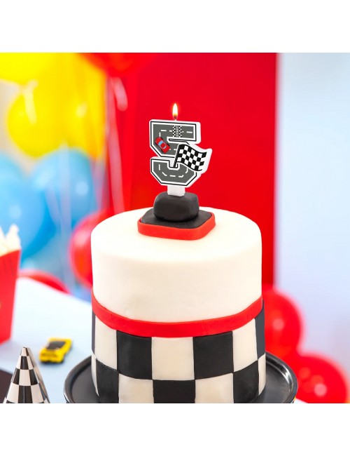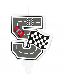 Lumanare tort, Cifra 5, din parafina alba, suport din plastic, cu imaginea unei piste de curse cu o masina rosie si steagul alb-negru pentru finish.