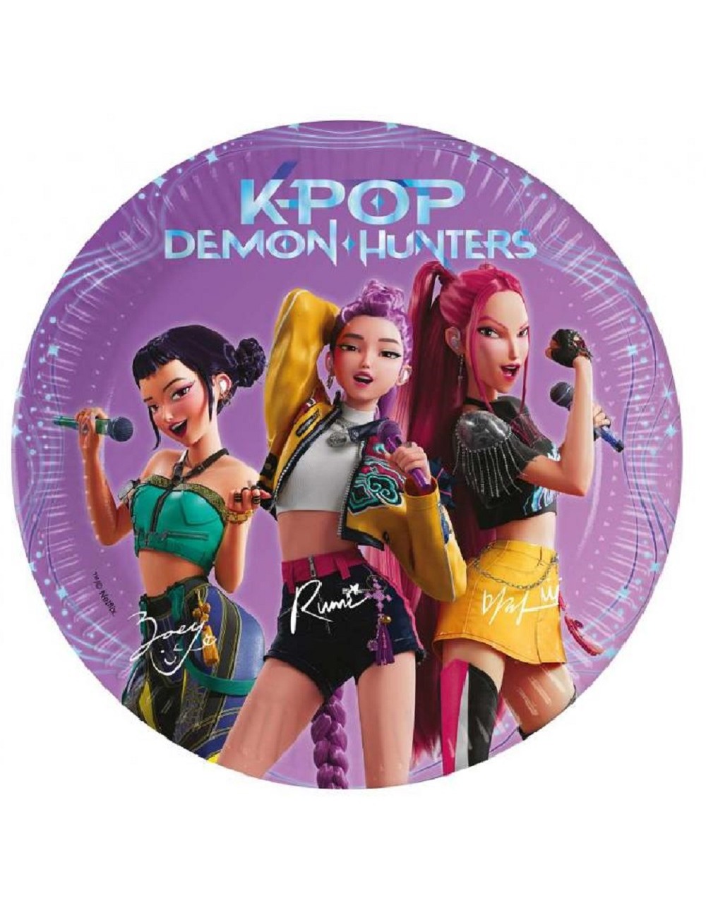 Set 8 farfurii K-Pop Demon Hunter, de unica folosinta, din carton, diametru 20 cm, imprimeu multicolor cu superstarurile K-pop Rumi, Mira și Zoey (Fetele K-pop la vânătoare de demoni).