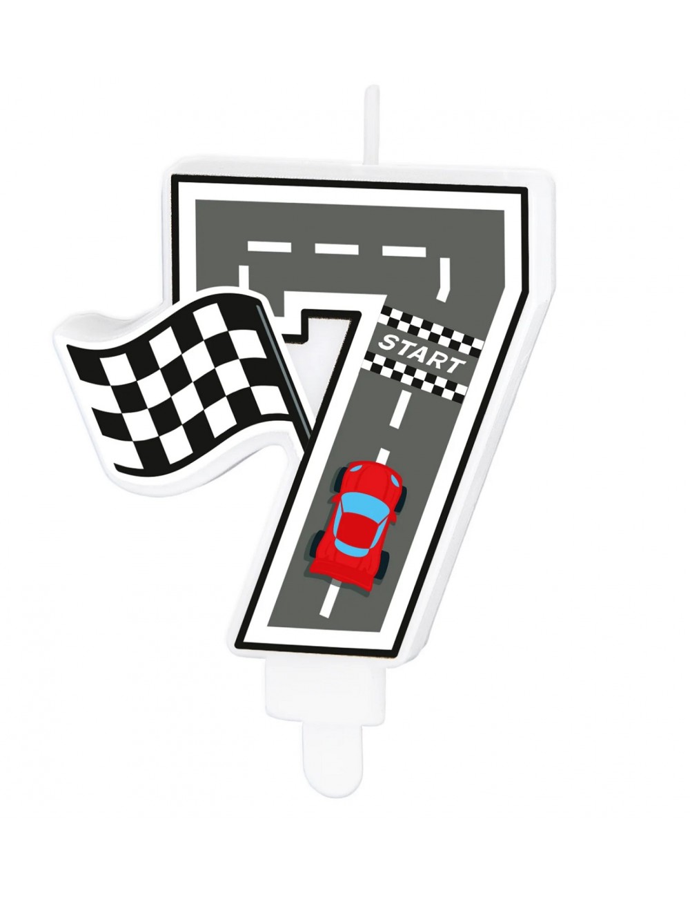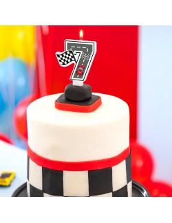 Lumanare tort, Cifra 7, din parafina alba, suport din plastic, cu imaginea unei piste de curse cu o masina rosie si steagul alb-negru pentru finish.