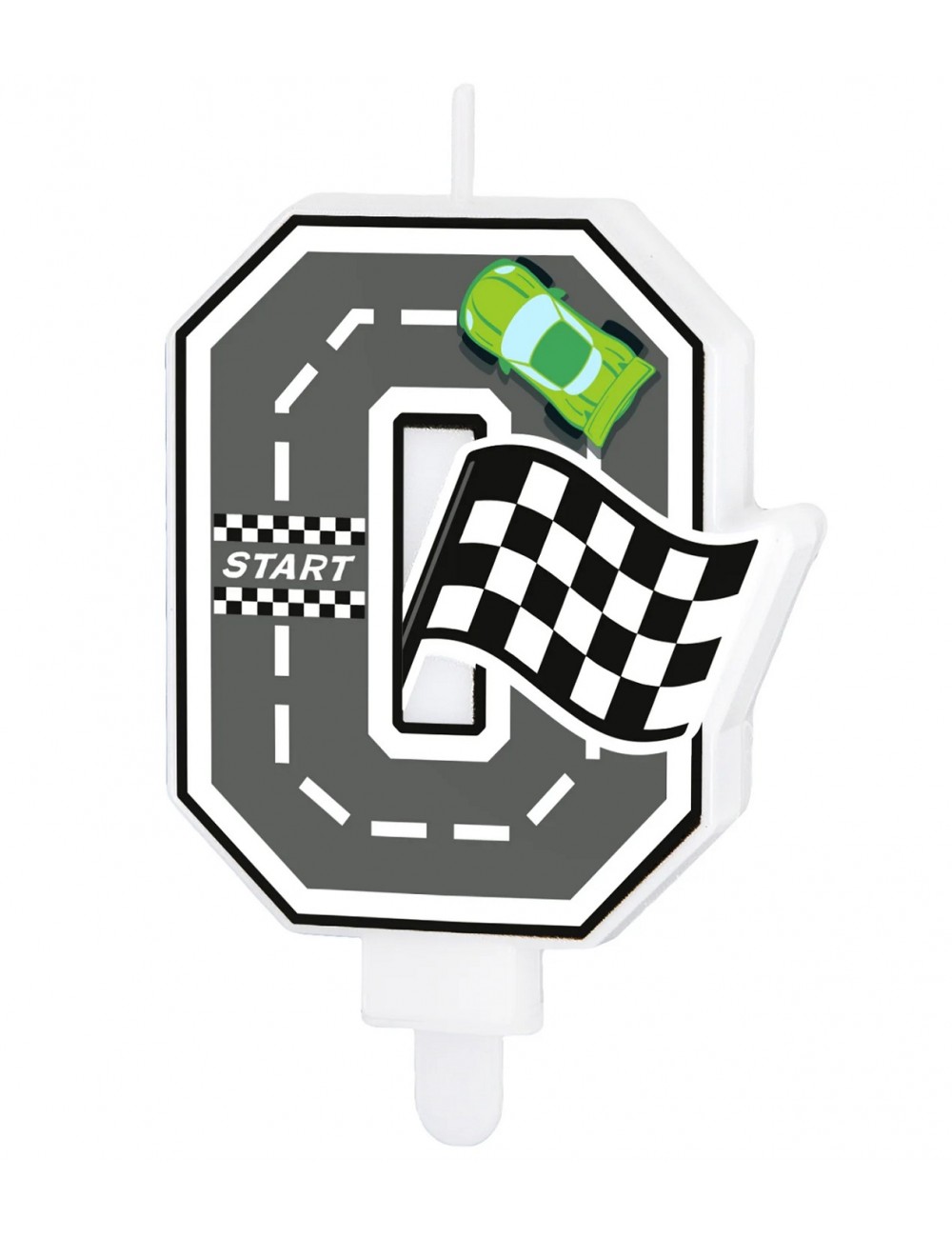 Lumanare tort Cifra 0, Pista curse Formula 1, din parafina alba, suport din plastic, cu imaginea unei piste de curse cu o masina verde si un steag de finish.