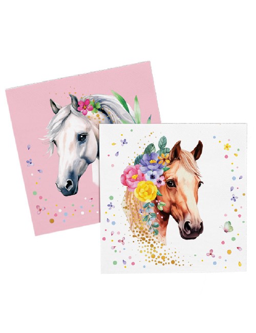 Set 20 servetele cu Cai fantezie, dimensiuni 33 x 33 cm (extins), din 3 straturi de hartie, imprimeu si culori (alb si roz) diferite pe cele 2 parti.