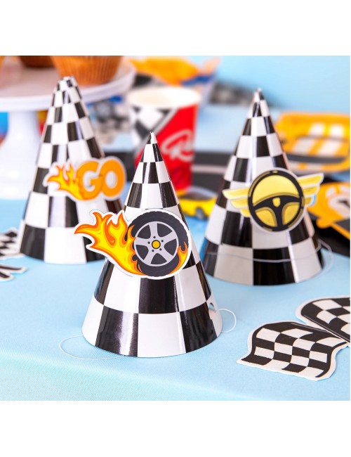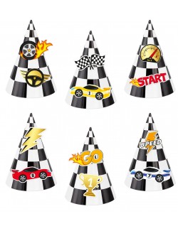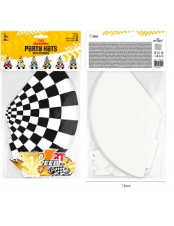 Set 6 coifuri Curse Race On si 12 autocolante, inaltime 16 cm, diametru 10 cm, din carton, culori alb-negru, stickere multicolore, prindere cu elastic.