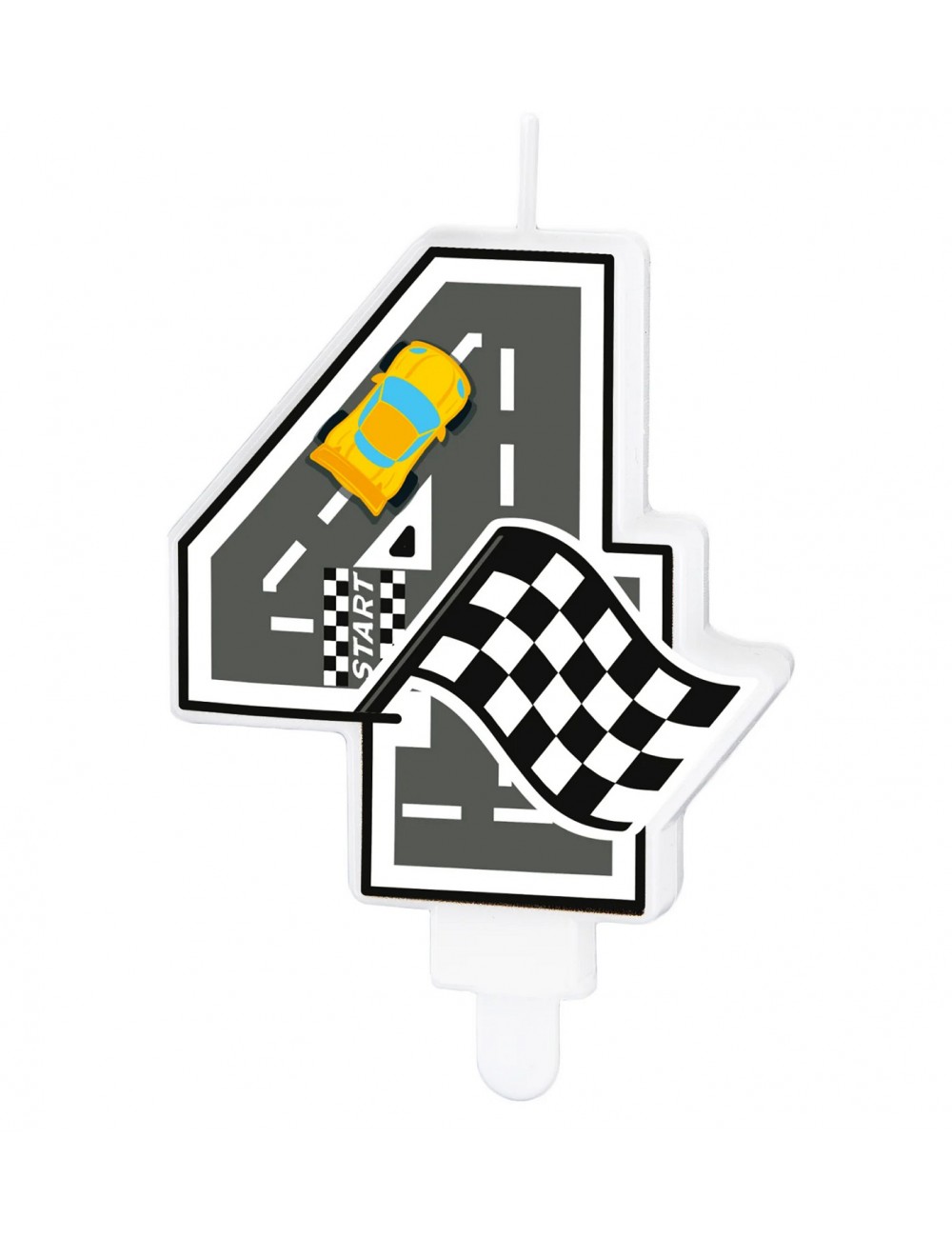 Lumanare tort Cifra 4, Pista curse Formula 1, din parafina alba, suport din plastic, cu imaginea unei piste de curse cu o masina galbena si steagul alb-negru pentru finish.