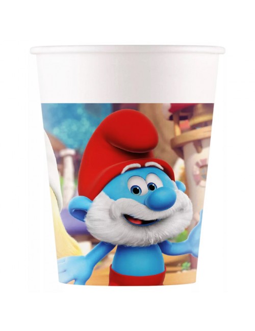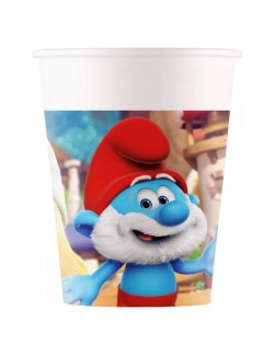 Set 8 pahare Strumfii, capacitate 200 ml, de unica folosinta, din carton, imprimeu amuzant cu strumfi.