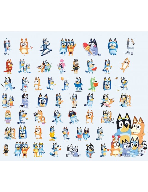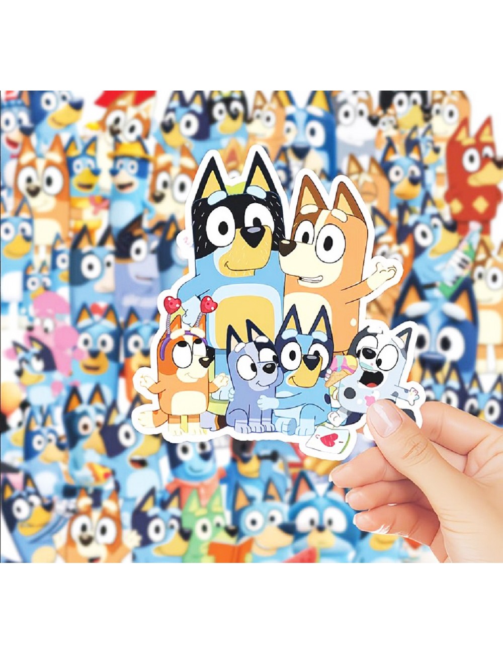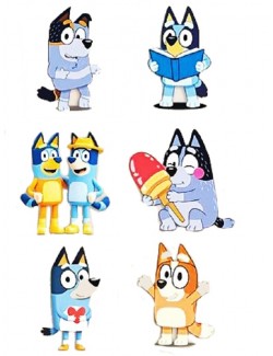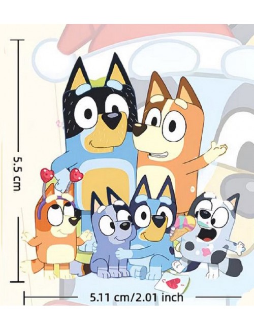 Set 10 autocolante Bluey Family, din hartie, imprimeuri diferite, dimensiuni cuprinse intre 4-6 cm, combinate in mod aleatoriu in fiecare set.