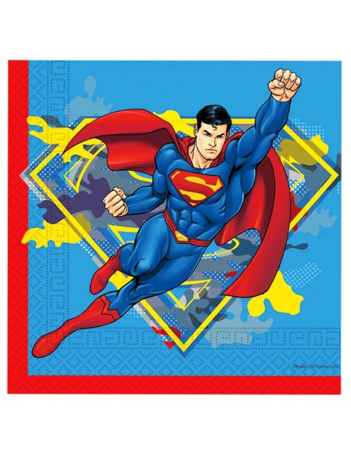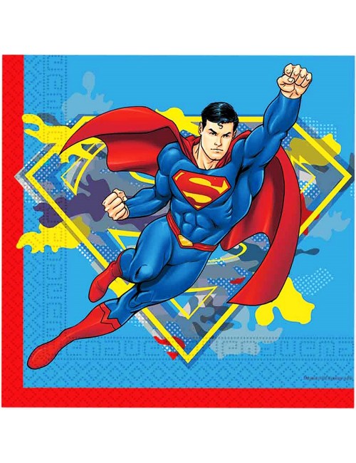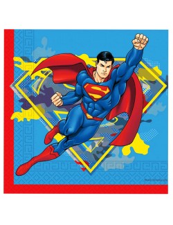 Set 20 servetele Superman Krypton, dimensiuni 33 x 33 cm (extins), din 2 straturi de hartie, imprimate cu Superman, fond albastru, garnitura rosie.