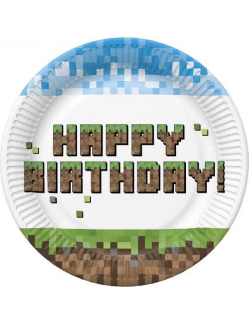 Set 8 farfurii Pixel Block Happy Birthday, de unica folosinta, din carton, diametru 23 cm, pentru petreceri pixelate Minecraft.