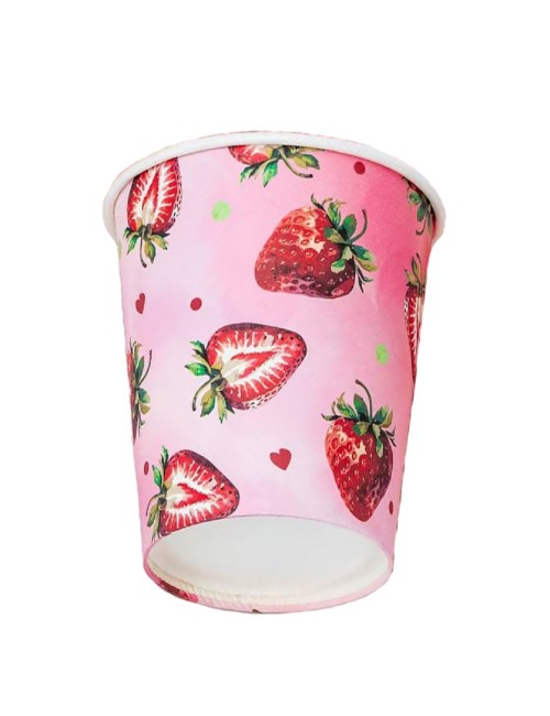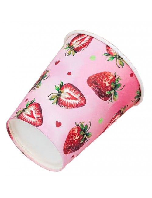 Set 8 pahare cu Capsune, din carton, capacitate 200 ml, de unica folosinta, inaltime 8,5 cm, culoare roz.