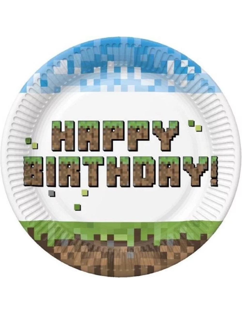 Set 8 farfurii desert, Pixel Block Happy Birthday, de unica folosinta, din carton, diametru 18 cm, pentru petreceri pixelate Minecraft.
