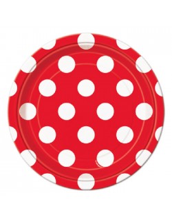Set 8 farfurii Rosii cu Buline albe, diametru 17 cm, de unica folosinta, fabricate din carton.