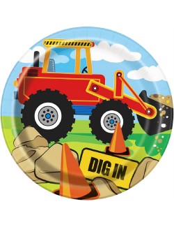 Set 8 farfurii Party Constructii, 17 cm, de unica folosinta, fabricate din carton, imprimate cu un excavator in plina activitate. culori frumoase si vii, materiale ecologice.