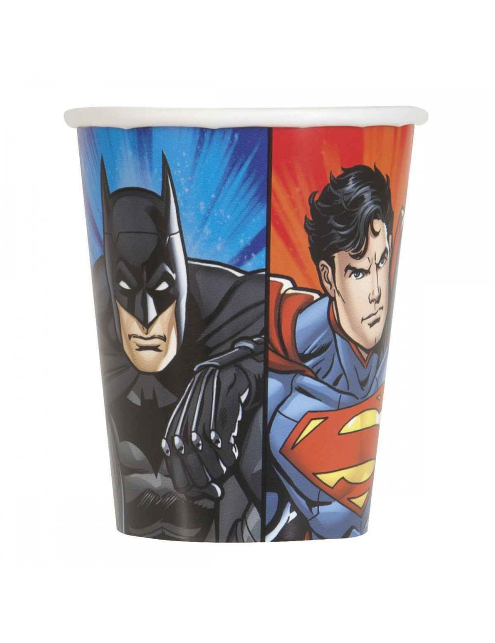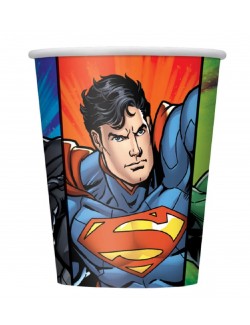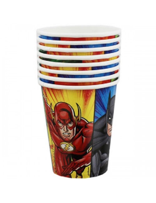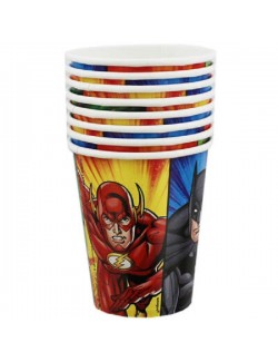 Set 8 pahare Super-eroi Justice-League, capacitate 270 ml, din carton, de unica folosinta, imprimate cu super-eroii Batman, Superman, Green Lantern si Flash.