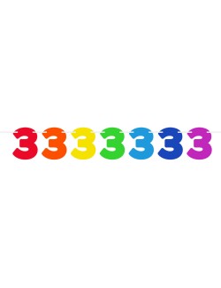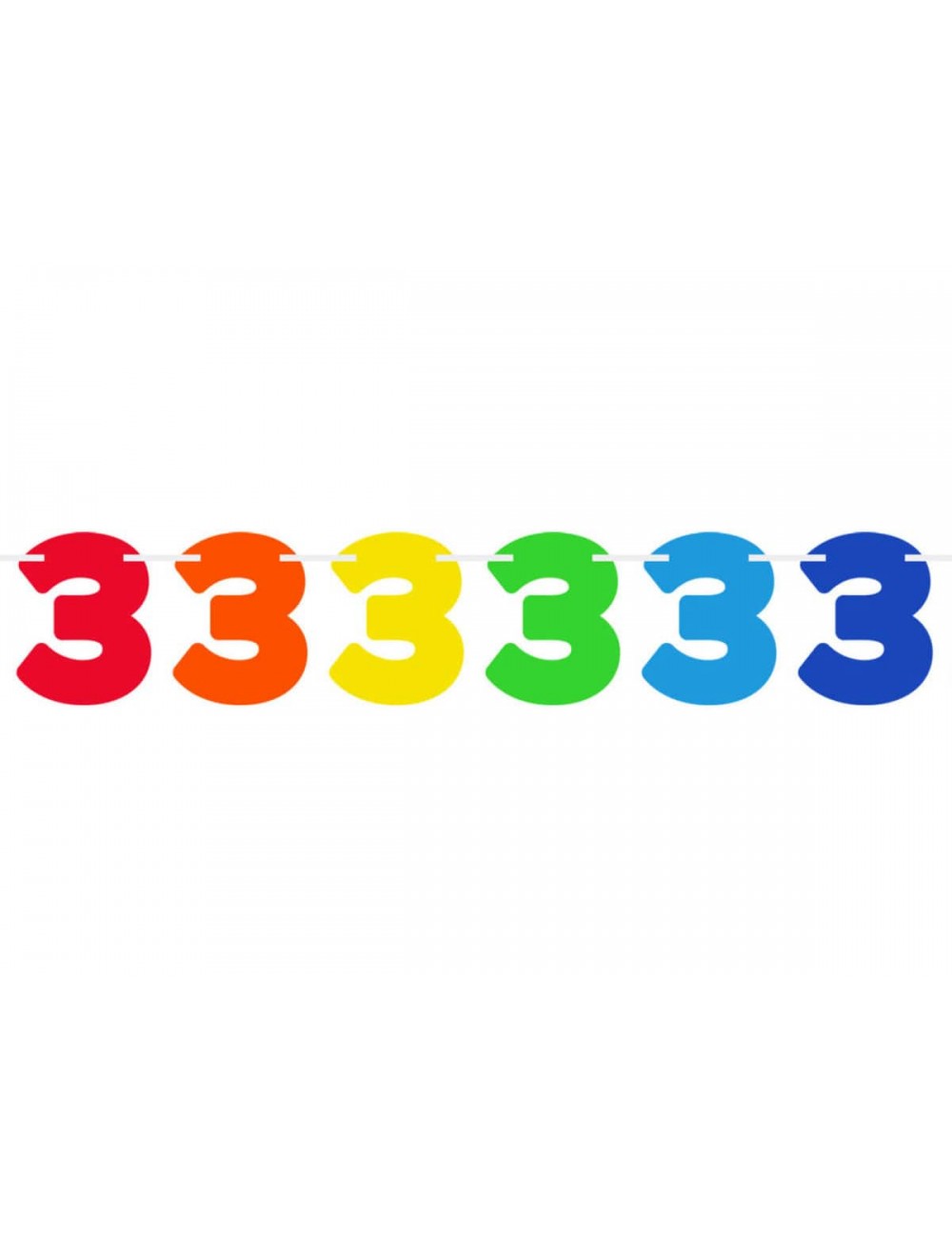 Ghirlanda multicolora, cifra 3, alcatuita din 7 fanioane de hartie cu forma cifrei 3, perfecta pentru petreceri aniversare.