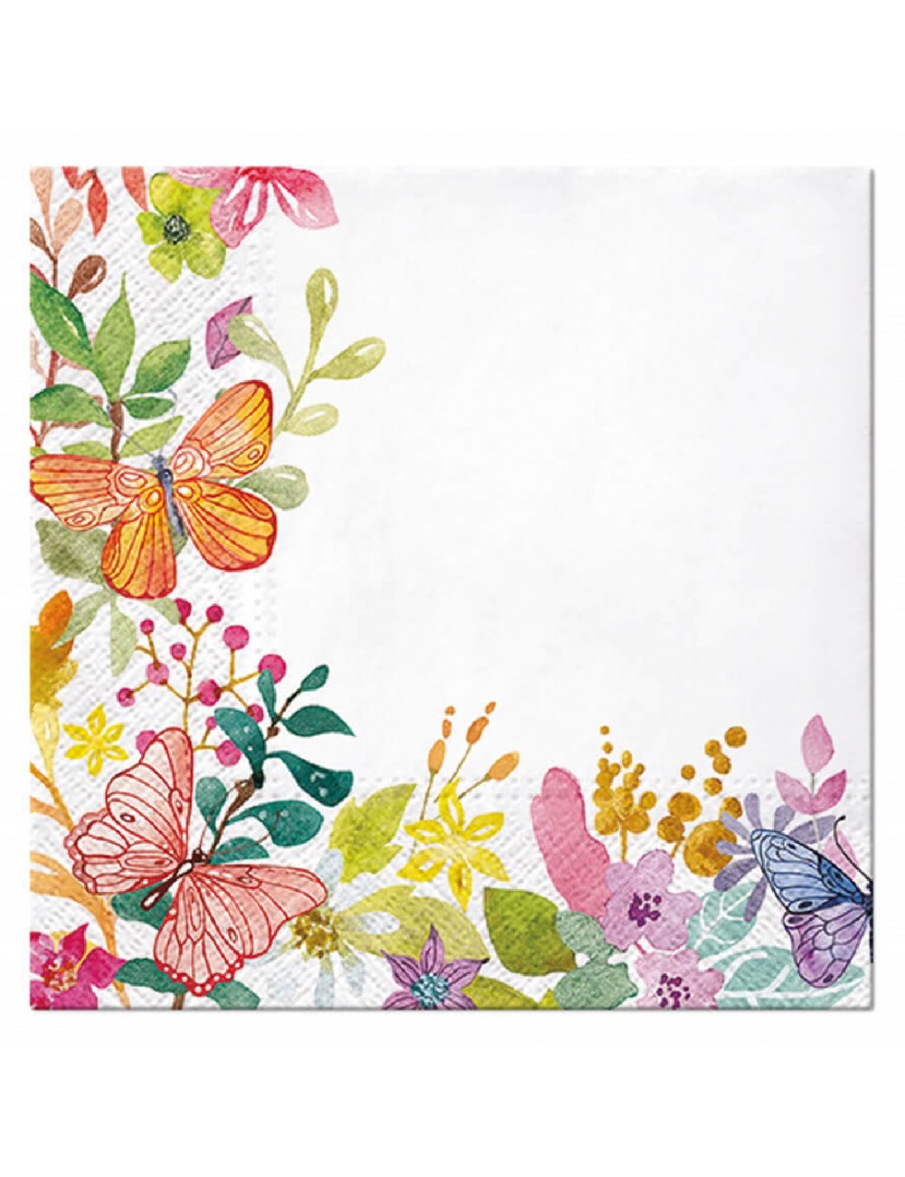 Set 20 servetele Flori si Fluturi, dimensiuni 33 x 33 cm (extins), din 3 straturi de hartie fina, fond alb, imprimeu multicolor.