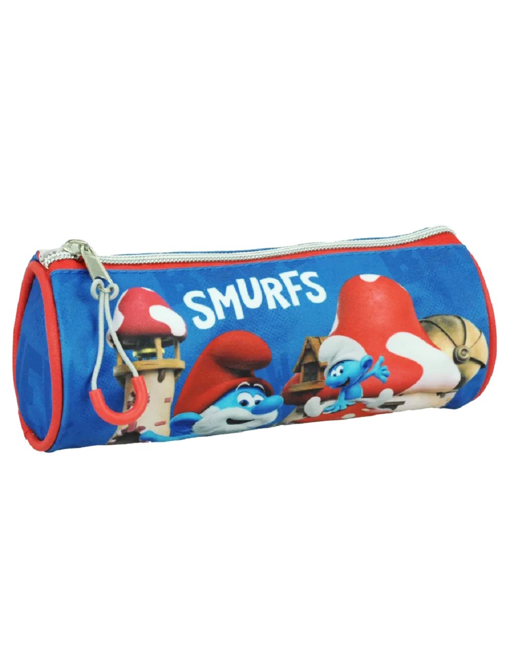Penar cilindric Strumfi, dimensiuni 21 X 7,5 cm, culoare albastra cu imprimeu multicolor, inchidere cu fermoar, material rezistent, 100% poliester.