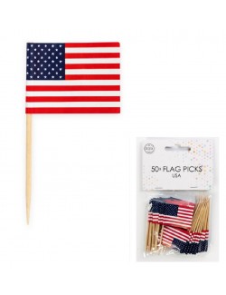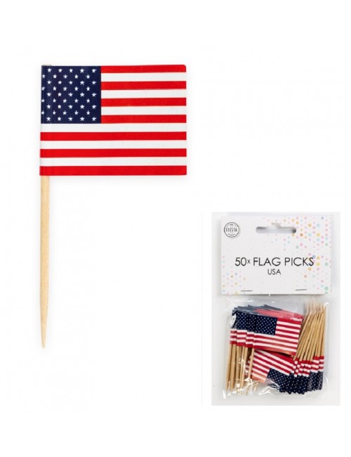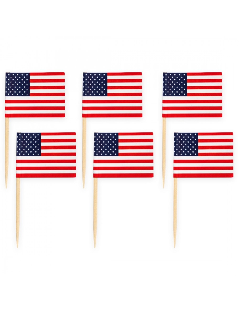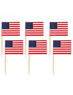 Set 50 Scobitori Steag SUA, inaltime aprox. 6 cm, stegulet 2,5 x 3,5 cm, suport din lemn si steag din hartie imprimata.