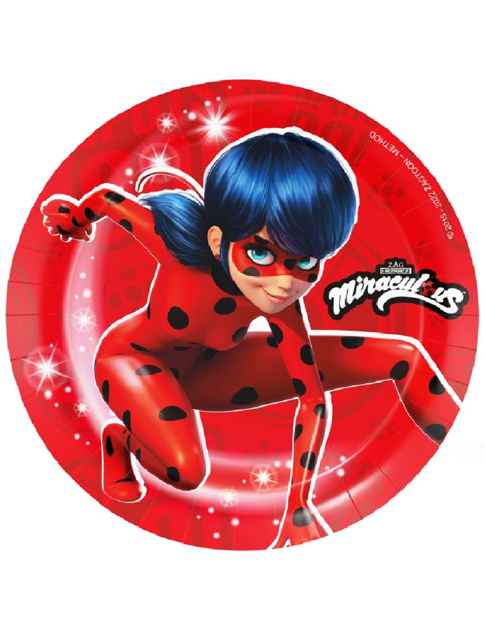 Set 8 farfurii Buburuza Miraculoasa, diametru 23 cm, de unica folosinta, din carton, potrivite pentru petreceri tematice Miraculous Ladybug si Motan Noir.